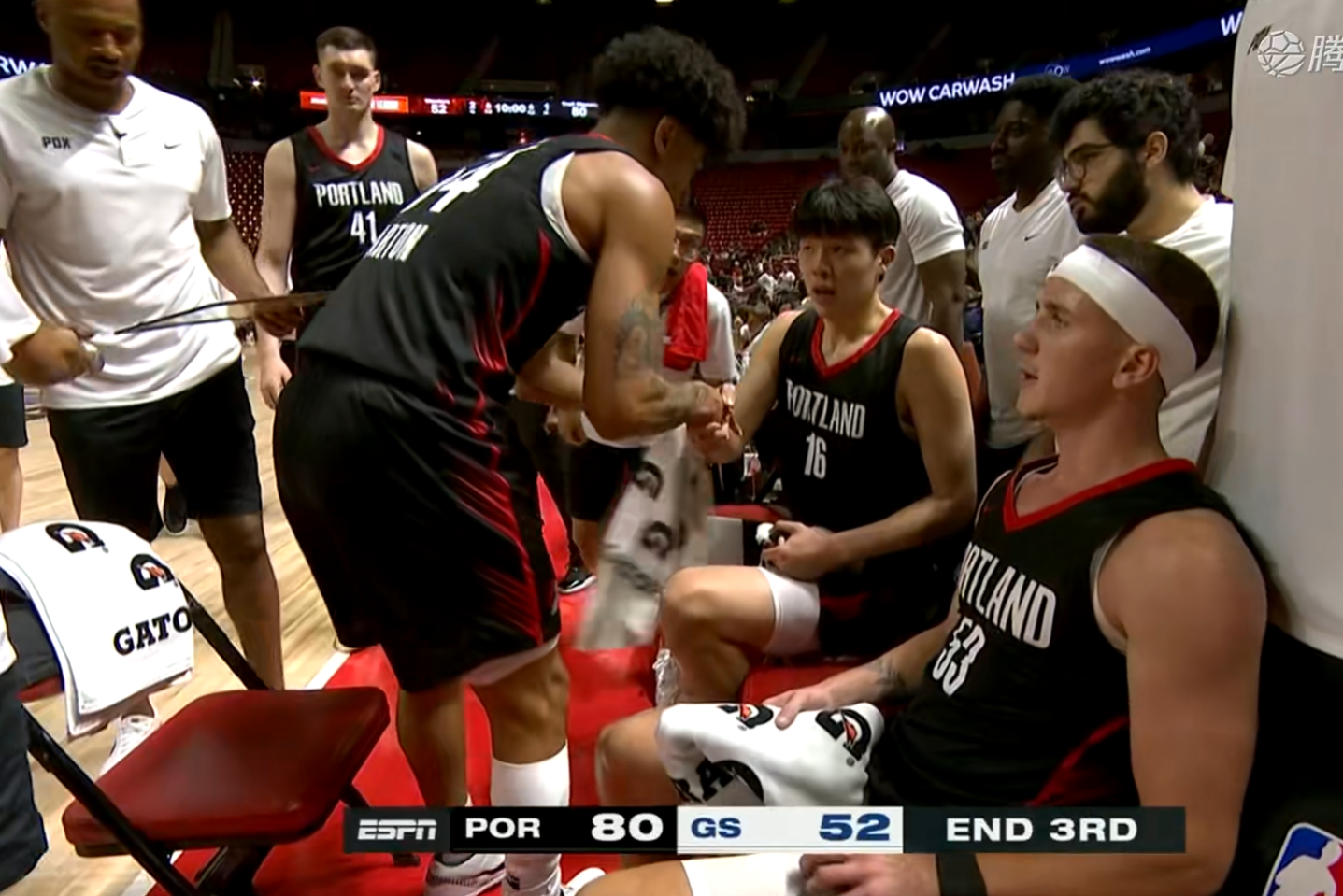 而且还有非常不可思议的一个进球,后面他自己运球找小个队友进行挡拆,竟然自己从三分线外运球滑翔上篮命中!2米16的大个从三分线外运球后转身上篮,队友都看呆了,而接下来当他被换下的时候,所有队友已经被他给征服了,全队起立鼓掌送上欢呼。