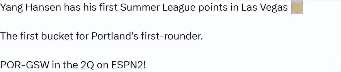 而此时开拓者队的主教练比卢普斯也是在狂吹杨瀚森,同时一边吹小杨,一边拿起手机打电话了,这感觉是要把杨瀚森扶正提上首发了。NBA官方也是发推,晒图庆祝杨瀚森的精彩表演,用实力让美国队友尊重你,这就是杨瀚森第1场夏季联赛表现给我们传递出来的一个信号。